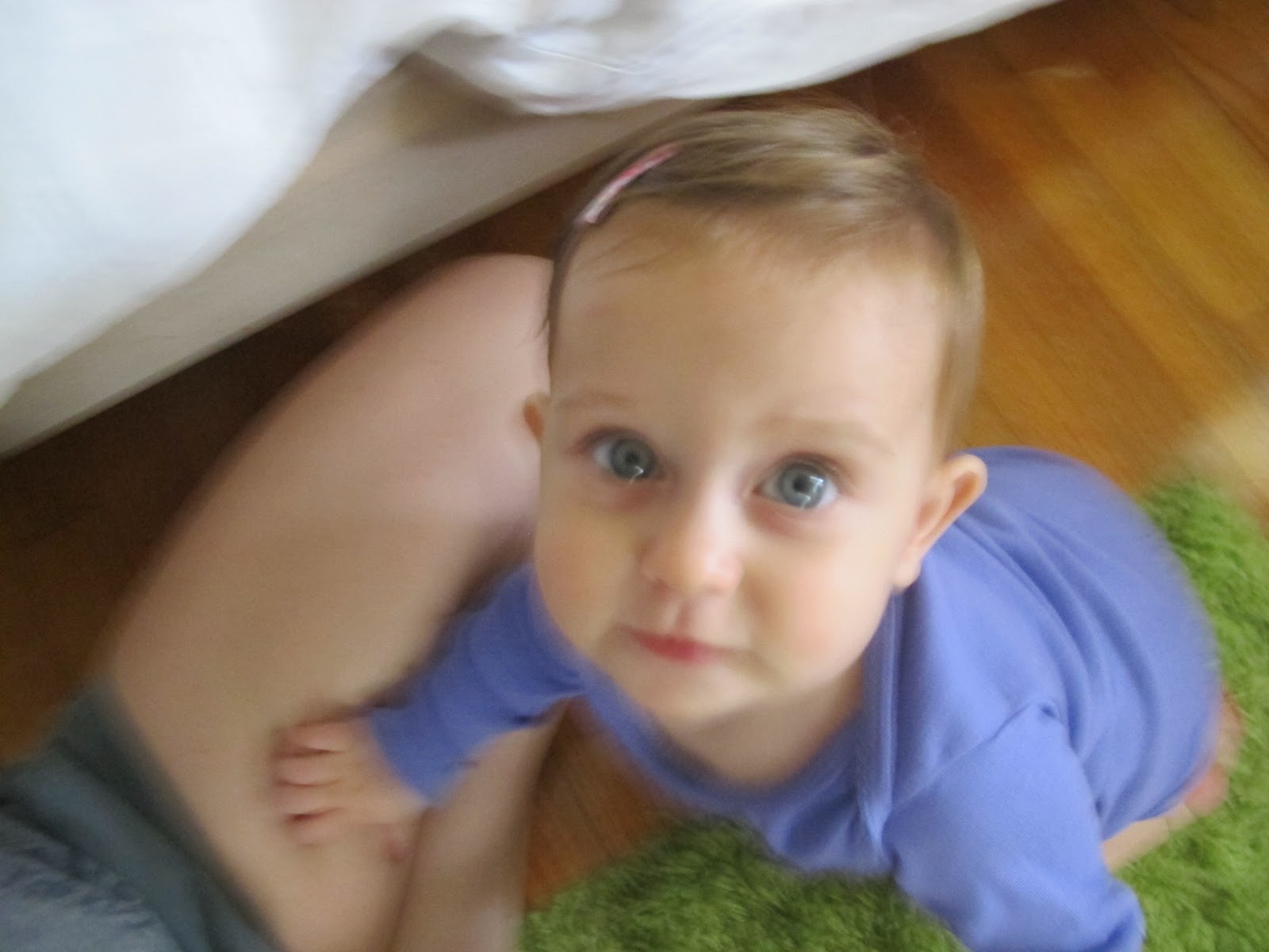 One moment, she's sitting on her pudgy diapered rear. The next, she has somewhere to be. Slap! Her hands pound the floor. Her head is up. Her legs scurry behind her. Right hand, left knee, left hand, right knee. Flip-flap, flip-flap, flip-flap. I edge behind her, mimicking her crawl, the debris on the somewhat clean floor poking my heavy knees like rocks. "Imgonnagetyou. Imgonnangetyou!" "Eeeeh!" she squeals as my arms come down on either side of her tiny body. "Eeeeeh!" "Igotyou!" I kiss her neck and her belly. She laughs that giggly baby laugh. She stops, sits up, still smiling. And then she remembers she has somewhere to be. Slap!